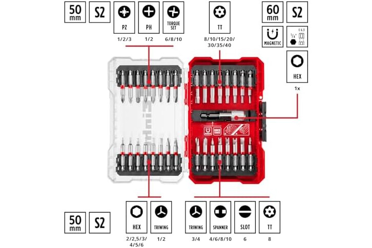 Robuste Bits – Dank des robusten, sandgestrahlten S2 Stahls, überzeugen die 50 mm langen Bits mit E 6.3 Schaft und Farbring des Einhell Sets mit höchster Qualität und Langlebigkeit.