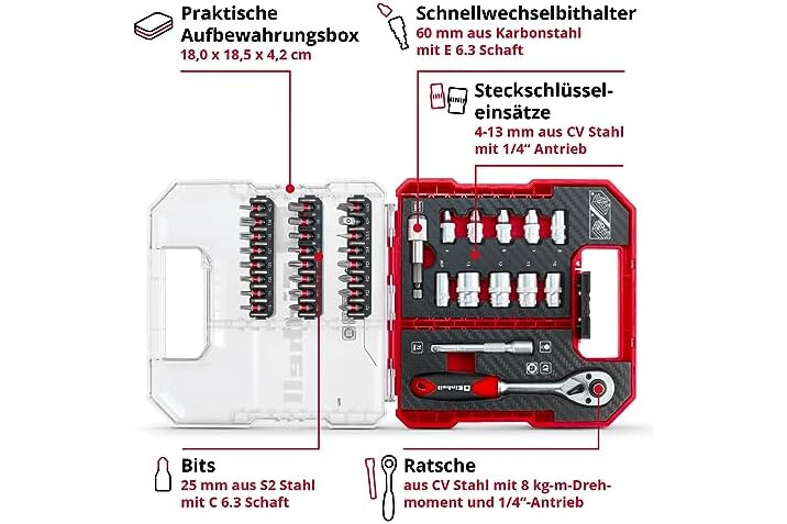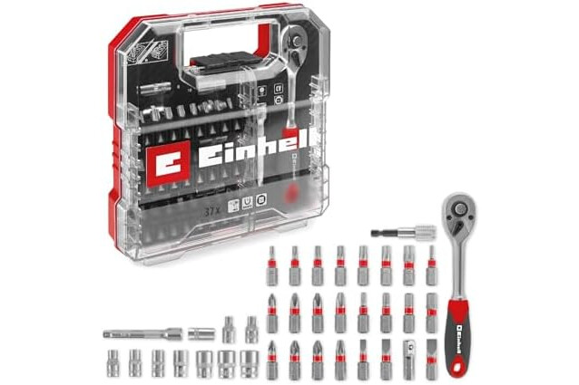 Original Einhell L-CASE 37-tlg. Bit- und Ratschen-Set (25-mm-Bits, Ratsche, Schnellwechselbithalter, Steckschlüssel, Adapter, Stecknussverlängerung inkl. Aufbewahrungsbox)