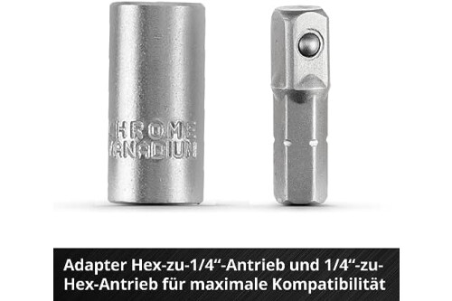 Steckschlüssel – Teil des Einhell Bit-Sets sind die grau sandgestrahlten Steckschlüsseleinsätze aus CV Stahl mit 1/4"-Antrieb, langer Lebensdauer und hoher Leistungsfähigkeit.