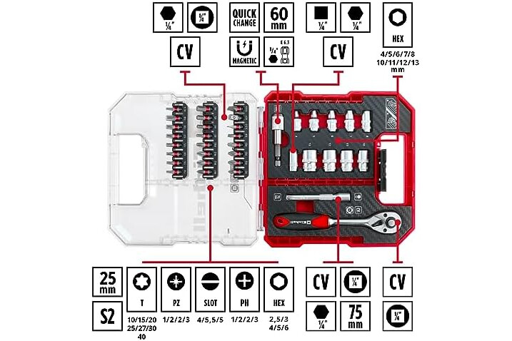 Schnellwechselbithalter – Für einen schnellen und einfachen Bitwechsel sorgt der 60 mm lange Schnellwechselbithalter aus Karbonstahl, der das Bit- und Ratschen-Set ergänzt.