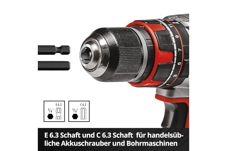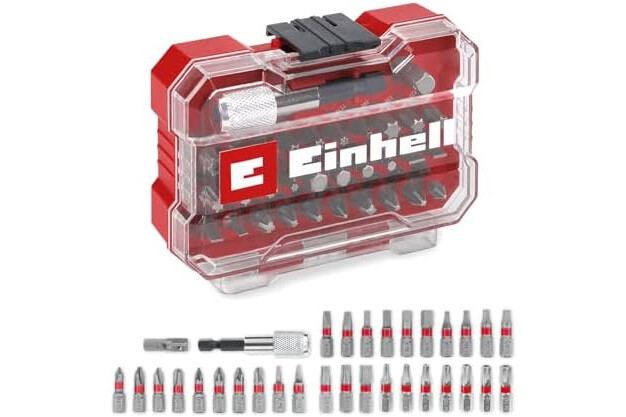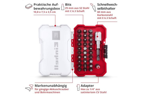 Lieferumfang | 1x Adapter Hex zu 1/4", 1x Aufbewahrungsbox, 30x Bits in 25 mm, 1x Schnellwechselbithalter |