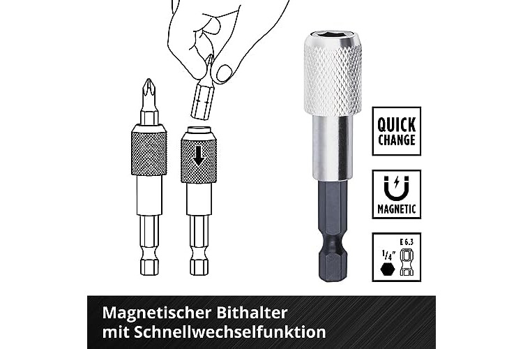 Schnellwechselbithalter – Für einen schnellen und einfachen Bitwechsel sorgt der 60 mm lange Schnellwechselbithalter aus Karbonstahl, der das Bit- und Steckschlüssel-Set ergänzt.