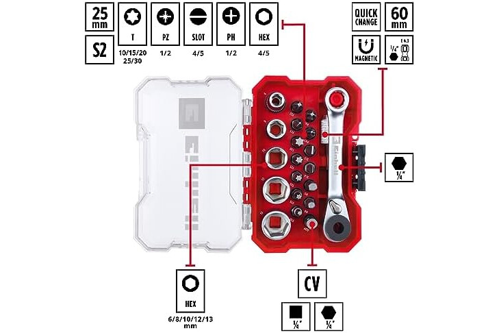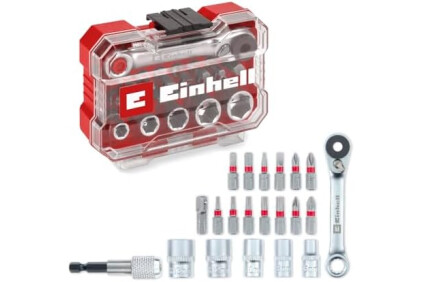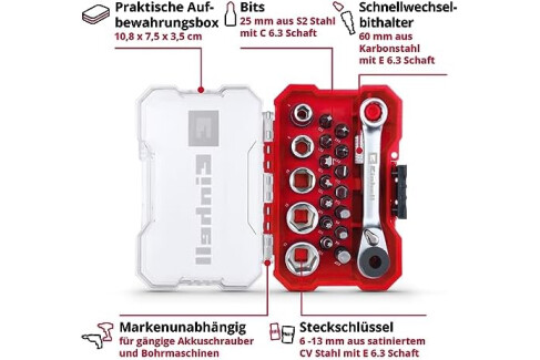 Original Einhell XS-CASE 21-tlg. Bit- und Steckschlüssel-Set (25-mm-Bits, Steckschlüssel, Schnellwechselbithalter, Adapter, Umschaltknarre inkl. Aufbewahrungsbox)