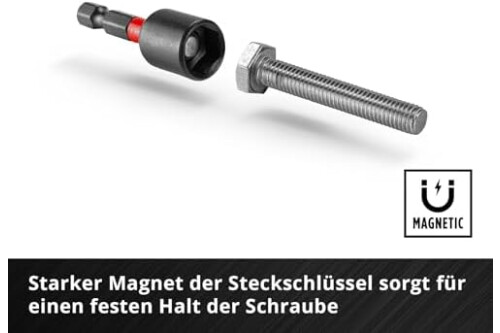 Schlagfeste Sechskantsteckschlüssel – Die magnetischen Steckschlüssel des Einhell Bit-Sets mit E 6.3 Schaft aus widerstandsfähigem 50BV30 Stahl sind für hohe Drehmomente ausgelegt.