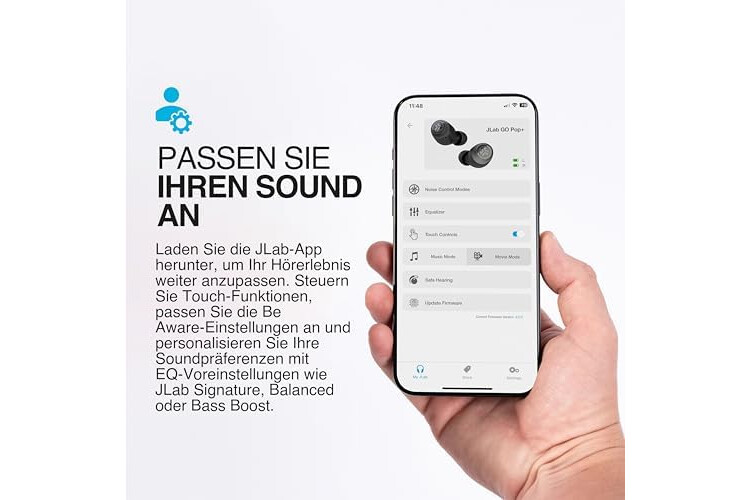 BENUTZERDEFINIERTER SOUND ÜBER JLAB APP: Verwenden Sie die JLab App, um Ihre Go Air Pop+ In Ear Kopfhörer kabellos anzupassen, einschließlich Be Aware, Touch-Steuerungen und Soundpräferenzen oder wählen Sie die JLab Signature, Balance oder Bass Boost EQ-Voreinstellungen