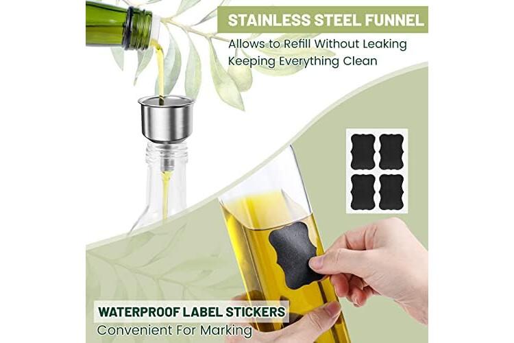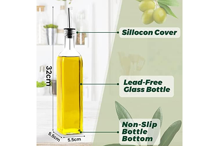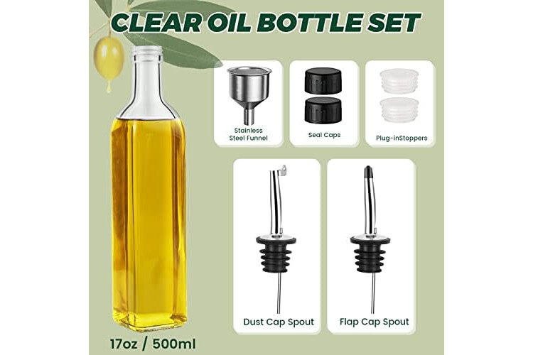 Ideales Set für Olivenölspender: Die Olivenölflasche ist aus bleifreiem Glas gefertigt und somit zu 100% gesundheits- und umweltfreundlich. Der Flaschenkörper ist transparent, so dass Verunreinigungen in der Flüssigkeit leicht zu erkennen sind. Die Kapazität beträgt 500 ml (17 oz), was für den Küchengebrauch ideal ist. Außerdem ist die Flasche spülmaschinenfest.