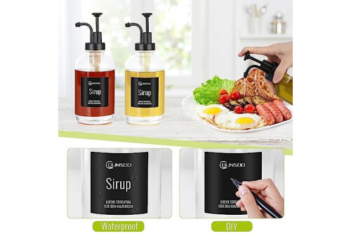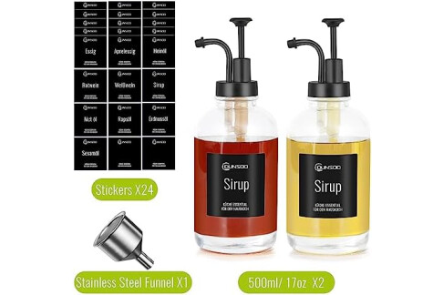 DUNSOO Kaffee Sirup Spender Set | 2 x 500 ml Sirup Pumpspender mit 24 Aufkleber,1Trichter aus Rostfreiem Stahl | Ölflasche mit Ausgießer für Küche (Black/500ml)