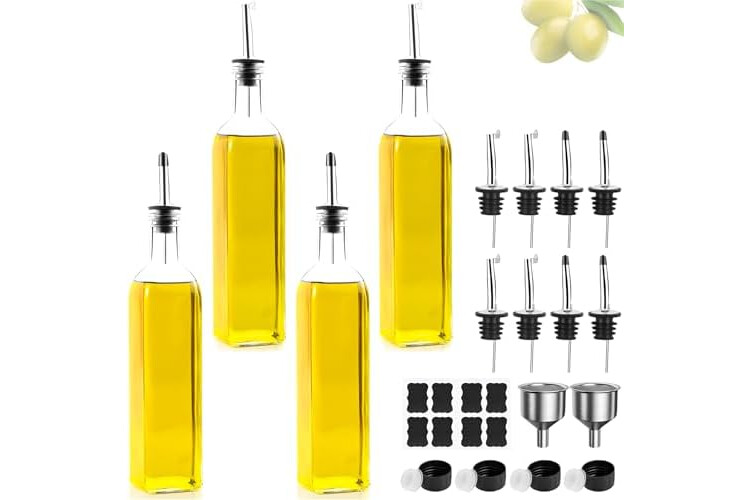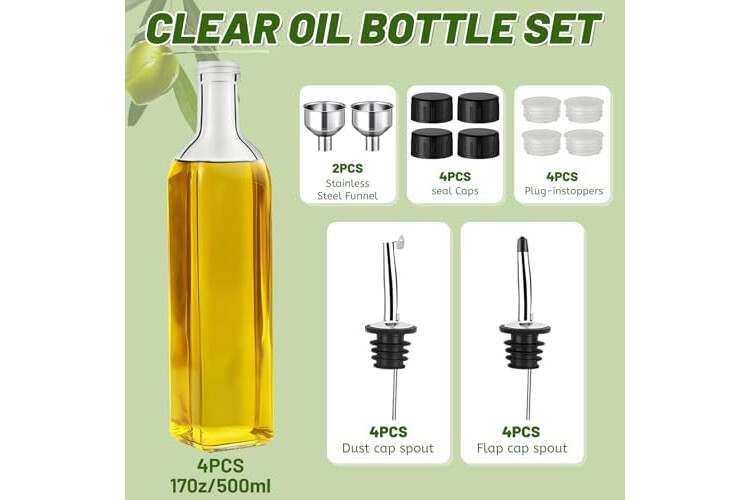 Ölflasche, 4x 500 ml Essig und Ölspender, Olivenölflasche mit Trichter, Anlaufgeschütztem Deckel, Etikett, Glasflasche für Küche und BBQ (Durchsichtig, 500ml)