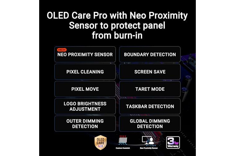 Neue ASUS OLED Care Pro-Funktionen mit Neo Proximity Sensor der automatisch den Bildschirm schwarz schaltet, wenn der Benutzer sich vom Gerät entfernt, um das Risiko von Einbrenneffekten zu reduzieren