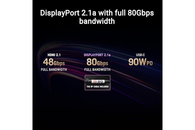 Zu den umfangreichen Anschlussmöglichkeiten gehören DisplayPort 2.1a UHBR20 mit voller 80Gbps Bandbreite, USB-C (90W PD), HDMI 2.1 und ein Stativanschluss