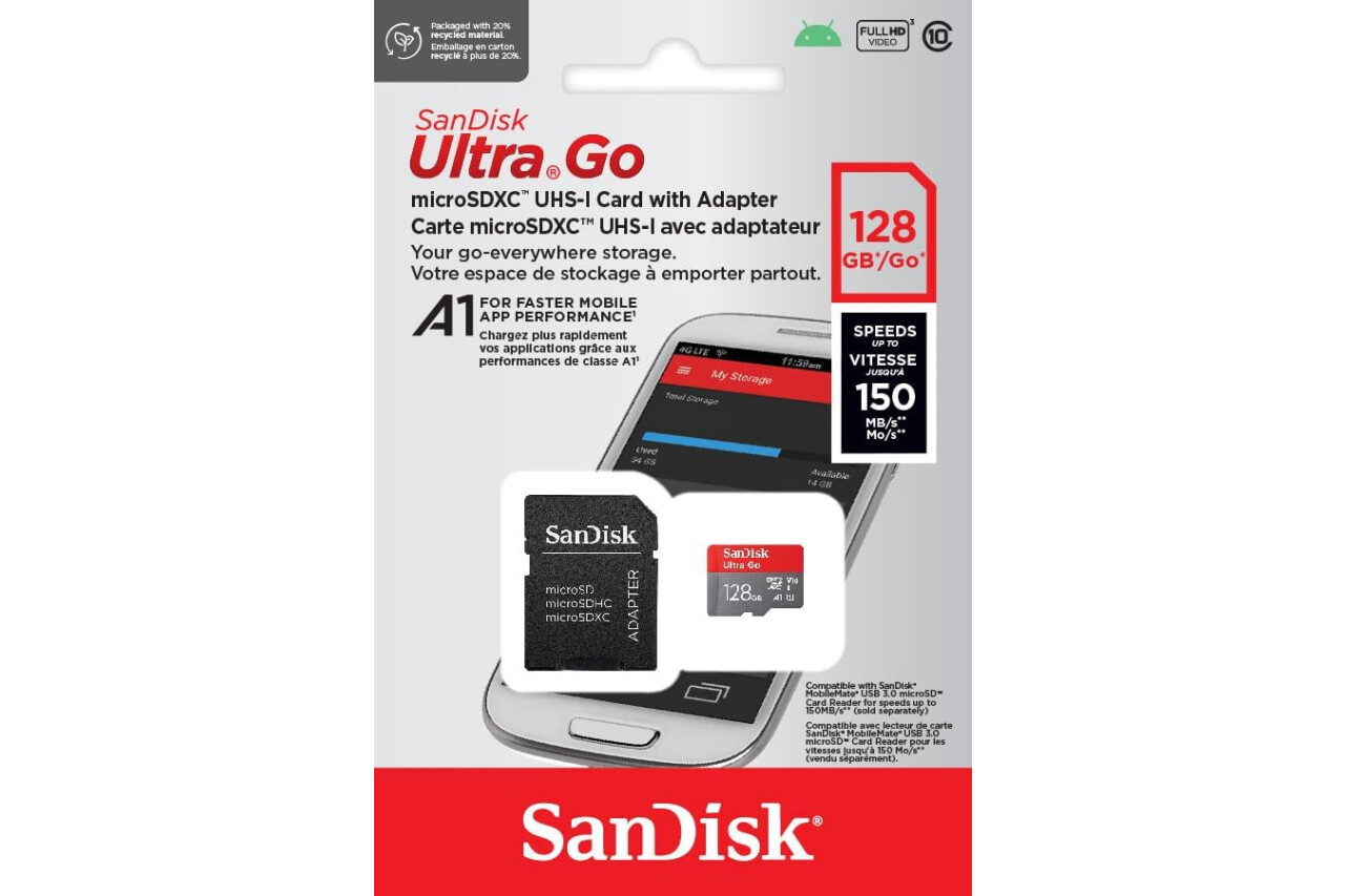 SanDisk Ultra Go Micro SDXC Speicherkarte 128 GB + SD Adapter (Für Android Smartphones und Tablets, bis zu 150 MB/s Lesegeschwindigkeit) A1, Full HD Video, UHS-I, Class 10, U1, Für Amazon