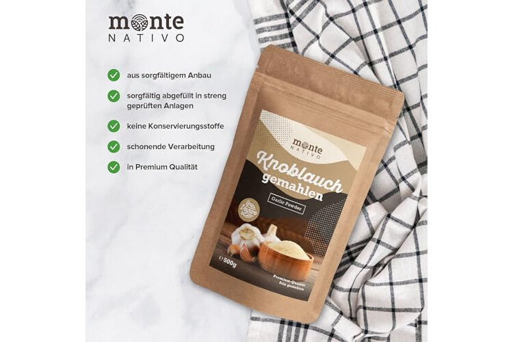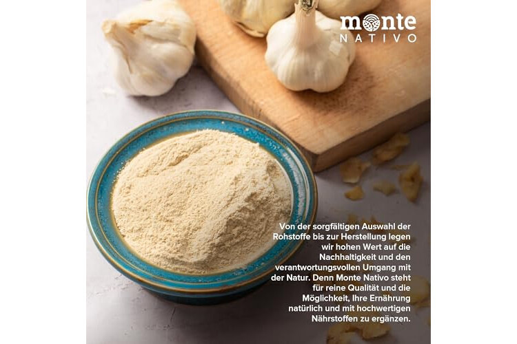 Rein und gesund: Monte Nativo Knoblauchgranulat enthält keine Zusatzstoffe, keine Konservierungsmittel und nichts anderes als echtes Knoblauchpulver, das sich für alle ihre kulinarischen Zwecke eignet.