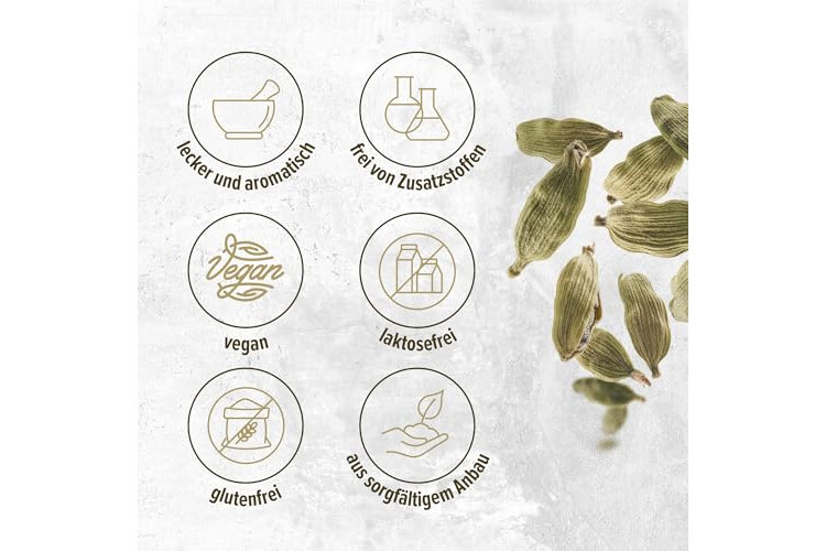 Gesicherte Frische: Unsere luftdichte Verpackung bewahrt die Frische und die ätherischen Öle und stellt sicher, dass der Kardamom bei jeder Verwendung genauso wirksam ist wie bei der ersten.