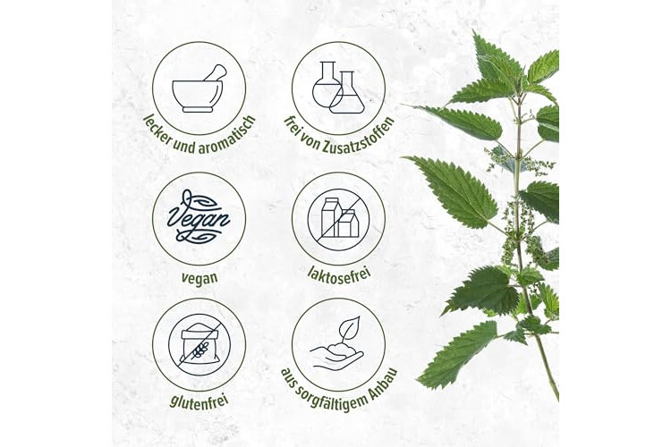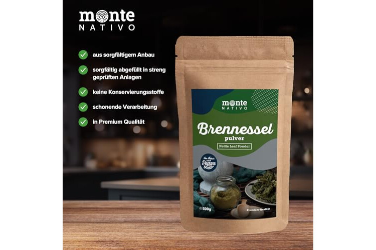Nährstoffreiches Superfood: Peppen Sie Ihre Rezepte mit den reichhaltigen Nährstoffen unseres Brennnesselpulvers auf, das für seine leuchtend grüne Farbe und seinen erdigen Geschmack bekannt ist und eine Vielzahl von Gerichten bereichert.