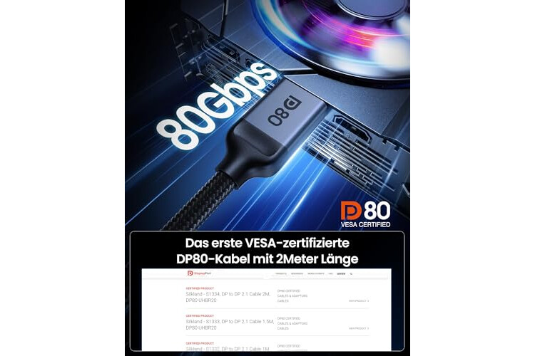 🚀【VESA-zertifiziertes DP80 Kabel】Silkland 2-Meter 16K DisplayPort 2.1 Kabel ist das erste VESA-zertifizierte DP80-Kabel. Es unterstützt unterstützt 16K@60Hz, 8K@240Hz, 4K@960Hz/540Hz/480Hz/360Hz mit aktivierter DSC1.2a. Kompatibel mit UHBR20, HDR10+, 3D, G-Sync FreeSync für erstklassige Visuals. Rückwärtskompatibel mit DP 2.0, DP 1.4 und DP 1.2 sowie mit fehlerfreiem 7.1/5.1/2.0 unkomprimiertem Audio-Durchgang.