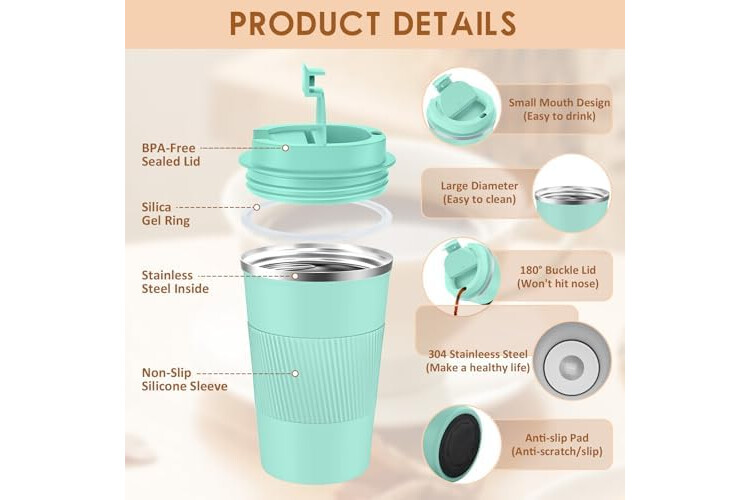 【Hochwertiges Material】KETIEE Travel Mug besteht aus hochwertigem 304 Edelstahl, ist sicher und langlebig und hält das Getränk ohne besonderen Geruch. Die neu verbesserte Anti-Rutsch-Schutzhülle verhindert das Herunterfallen des Bechers. Der Boden der Kaffeetasse aus Edelstahl Travel hat eine Gummisohle, um Kratzer oder Rutschen auf der Oberfläche zu vermeiden.