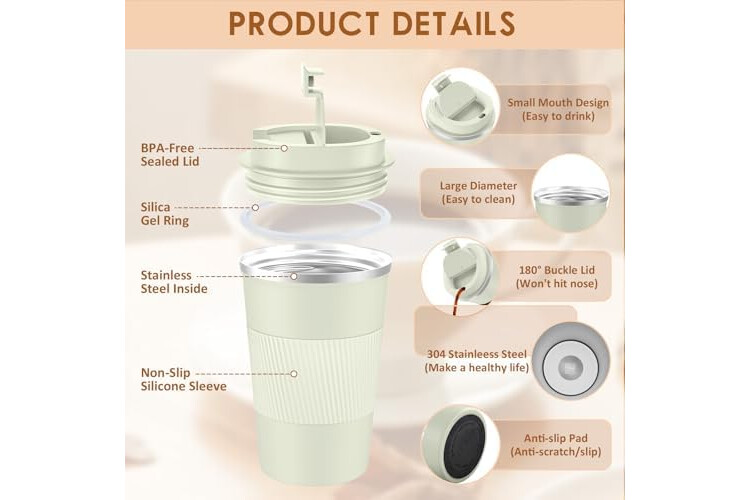 【Hochwertiges Material】KETIEE Travel Mug besteht aus hochwertigem 304 Edelstahl, ist sicher und langlebig und hält das Getränk ohne besonderen Geruch. Die neu verbesserte Anti-Rutsch-Schutzhülle verhindert das Herunterfallen des Bechers. Der Boden der Kaffeetasse aus Edelstahl Travel hat eine Gummisohle, um Kratzer oder Rutschen auf der Oberfläche zu vermeiden.