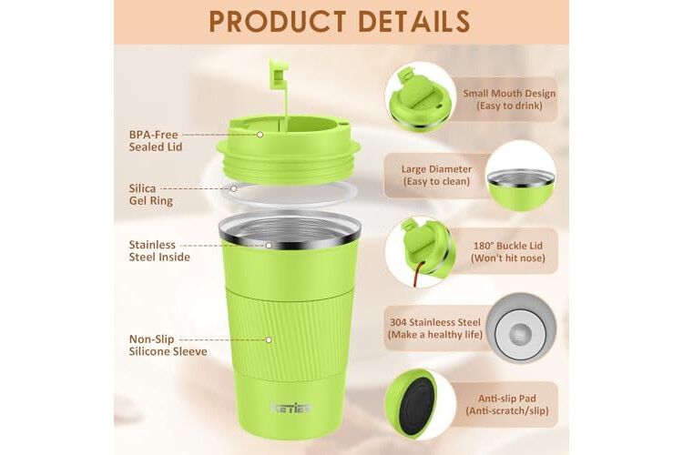 【Hochwertiges Material】KETIEE Travel Mug besteht aus hochwertigem 304 Edelstahl, ist sicher und langlebig und hält das Getränk ohne besonderen Geruch. Die neu verbesserte Anti-Rutsch-Schutzhülle verhindert das Herunterfallen des Bechers. Der Boden der Kaffeetasse aus Edelstahl Travel hat eine Gummisohle, um Kratzer oder Rutschen auf der Oberfläche zu vermeiden.