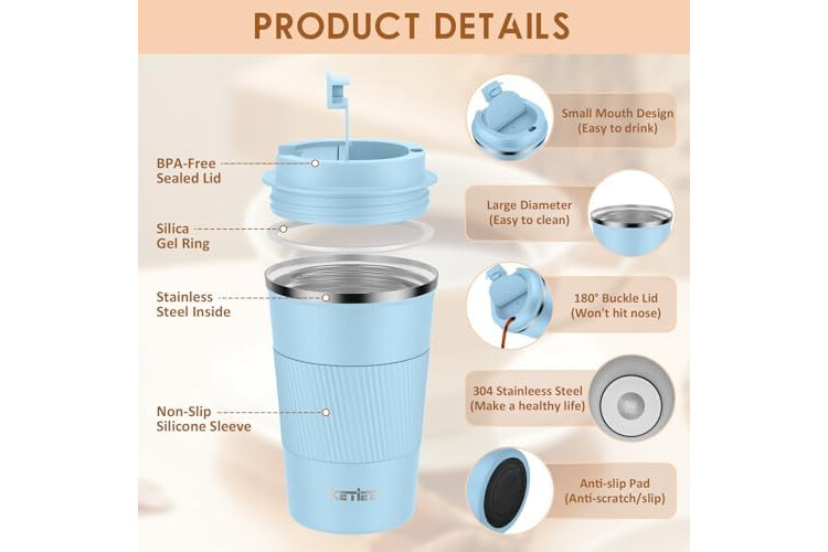 【Auslaufsichere Kaffee-to-go Becher】Unser thermobecher kaffee to go leckt auch dann nicht, wenn er um 360 ° geschüttelt und gekippt wird. KETIEE Kaffeebecher wird mit einem BPA-freien, auslaufsicheren Schraubdeckel und der Silikondichtung geliefert, um das Risiko von Verschüttungen zu minimieren.