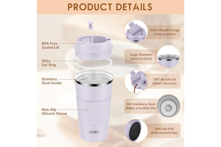 【Hochwertiges Material】KETIEE Travel Mug besteht aus hochwertigem 304 Edelstahl, ist sicher und langlebig und hält das Getränk ohne besonderen Geruch. Die neu verbesserte Anti-Rutsch-Schutzhülle verhindert das Herunterfallen des Bechers. Der Boden der Kaffeetasse aus Edelstahl Travel hat eine Gummisohle, um Kratzer oder Rutschen auf der Oberfläche zu vermeiden.