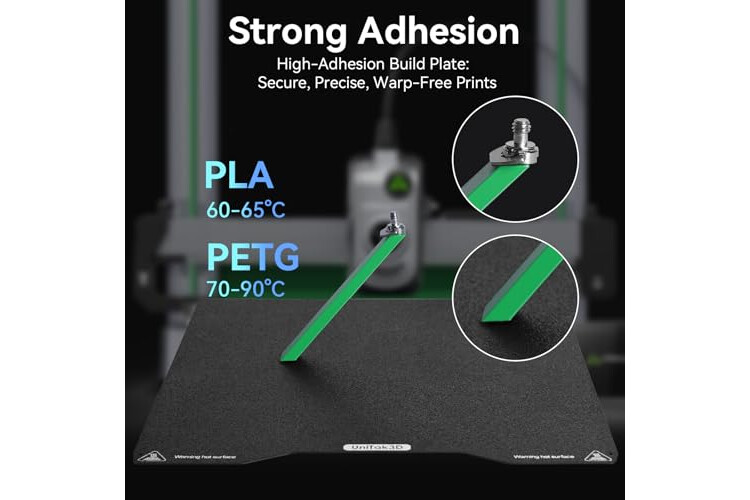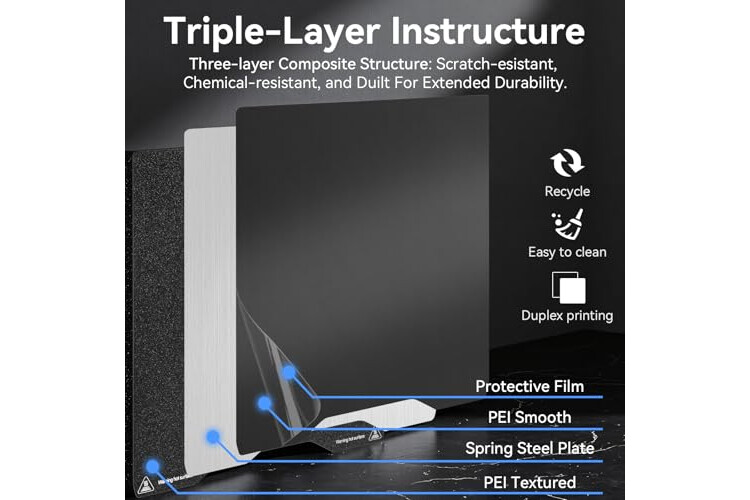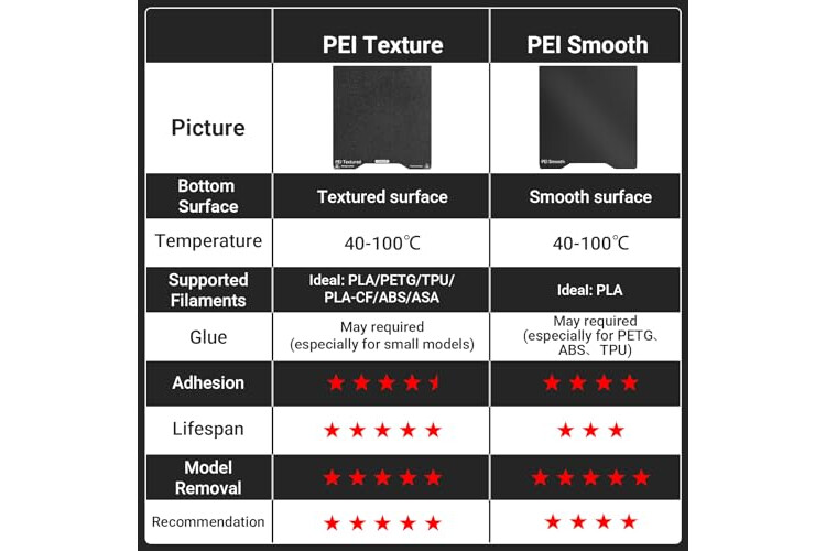 【Superior Adhesion】Die schwarze, strukturierte PEI-Seite bietet hervorragenden Halt (stärker als Standard-PEI in Gold) und hält die Modelle während des Drucks fest - kein Klebstoff oder Klebeband erforderlich. Perfekt, um Verformungen zu verhindern