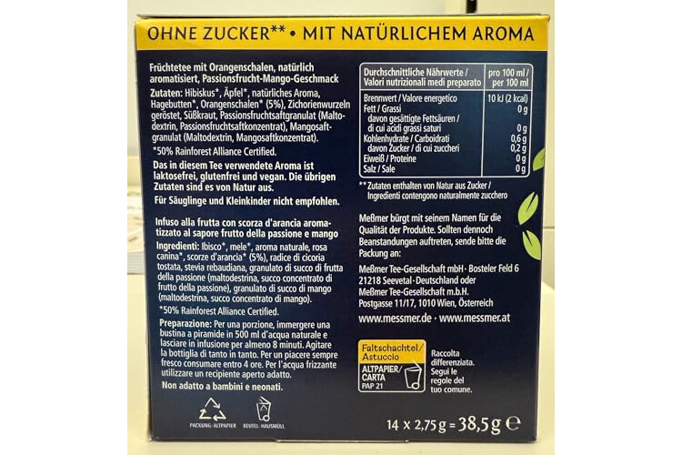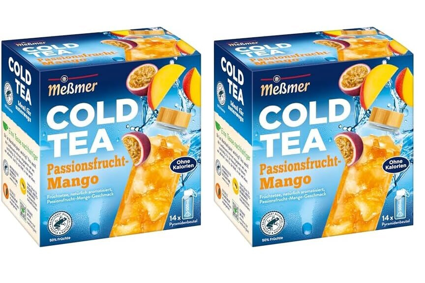 Meßmer Cold Tea Passionsfrucht-Mango | Belebe dein Wasser mit dem spritzigen Geschmack | ohne Zucker | ohne Kalorien | Alternative zu zuckerhaltigen Getränken wie Limonade | 14 Pyramidenbeutel