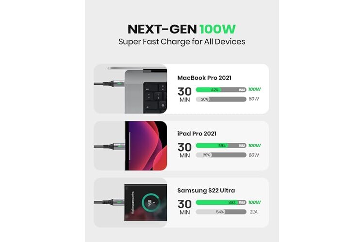 Ihr Laptop Bis zu 58% durch Neue Generation 100W Schneller Aufladen: Die neue 100W-PD-Technologie bringt die Ladegeschwindigkeit auf ein neues Niveau. Ihr MacBook Pro 16" wird in nur 45 Minuten auf 60% aufgeladen, 58% schneller als mit einem 60W-Kabel.