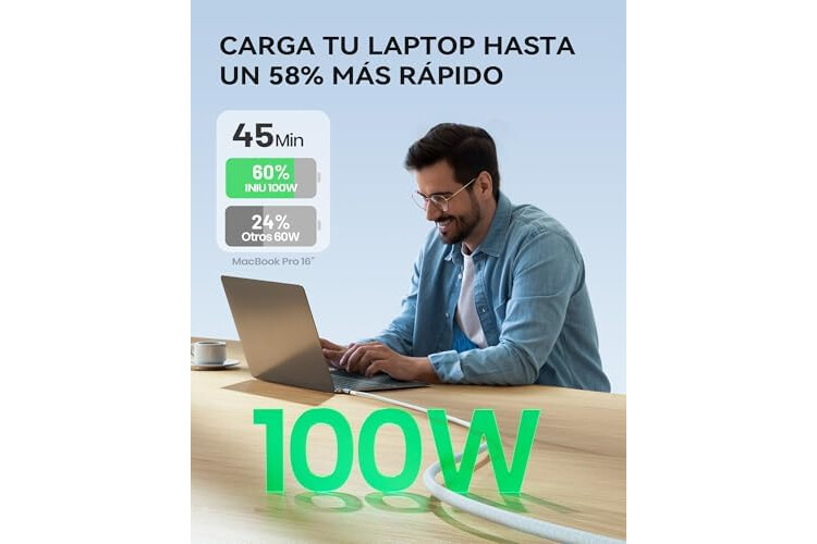 Ihr Laptop Bis zu 58% durch Neue Generation 100W Schneller Aufladen: Die neue 100W-PD-Technologie bringt die Ladegeschwindigkeit auf ein neues Niveau. Ihr MacBook Pro 16" wird in nur 45 Minuten auf 60% aufgeladen, 58% schneller als mit einem 60W-Kabel.