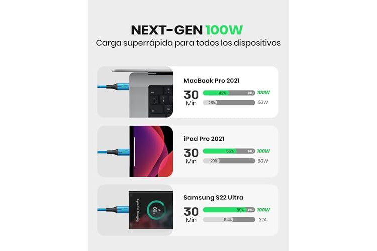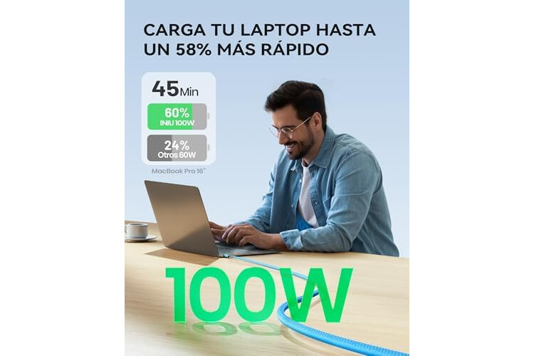 Ihr Laptop Bis zu 58% durch Neue Generation 100W Schneller Aufladen: Die neue 100W-PD-Technologie bringt die Ladegeschwindigkeit auf ein neues Niveau. Ihr MacBook Pro 16" wird in nur 45 Minuten auf 60% aufgeladen, 58% schneller als mit einem 60W-Kabel.