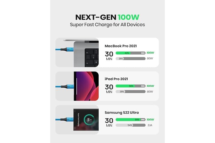 3,1A Schnelles Aufladen: Interne Kupferdrähte mit Supraleitfähigkeit ermöglichen einen sicheren und echten 3,1A-Ausgang, sodass Ihr Gerät mit maximaler Geschwindigkeit aufgeladen werden kann. Laden Sie Ihr Handy unglaublich schnell von 0 auf 70% in 30 Minuten auf.