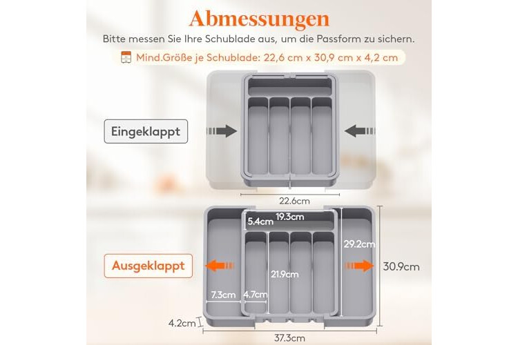 Verstellbare Breite: Dieser Besteckkasten für Schubladen lässt sich flexibel an unterschiedliche Schubladengrößen anpassen. Dank ausziehbarem und erweiterbarem Design misst er zusammengeklappt 22,6 × 30,9 × 4,2 cm und vollständig ausgezogen 37,3 × 30,9 × 4,2 cm