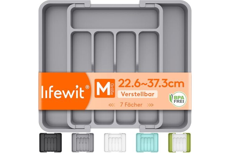 Lifewit Besteckkasten für Schubladen, verstellbarer Kunststoff Organizer Küche Tiefe 31 cm, Besteckeinsatz 5-7 Fächer, erweiterbar bis 37 cm, für Löffel und Gabeln, Grau, Mittel