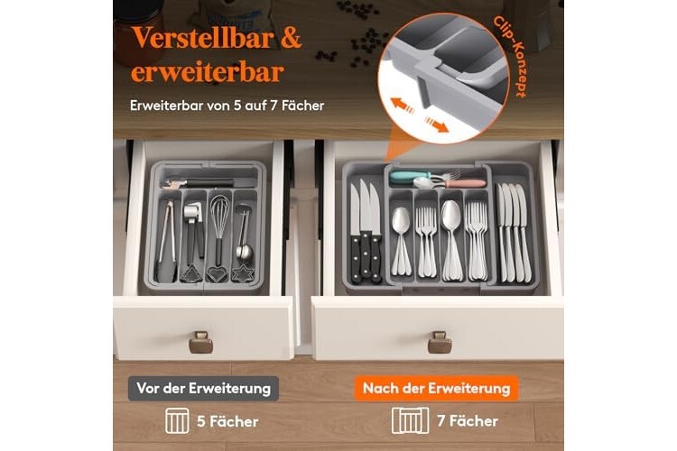 Große Kapazität mit Fächern: Mit 5 Hauptfächern und 2 ausziehbaren Seitenfächern bietet der Schubladenorganizer viel Platz für Besteck, Löffel, Gabeln, Messer und Küchenutensilien. Durch die klare Fächeraufteilung wird Ihre Besteckaufbewahrung zum effizienten Ordnungssystem
