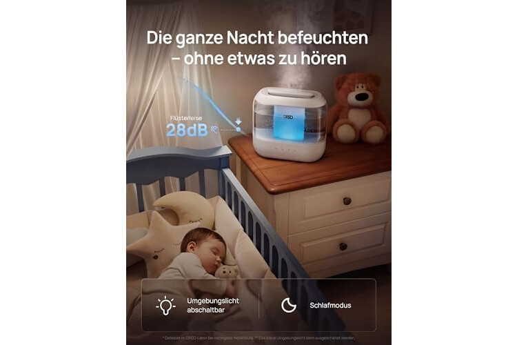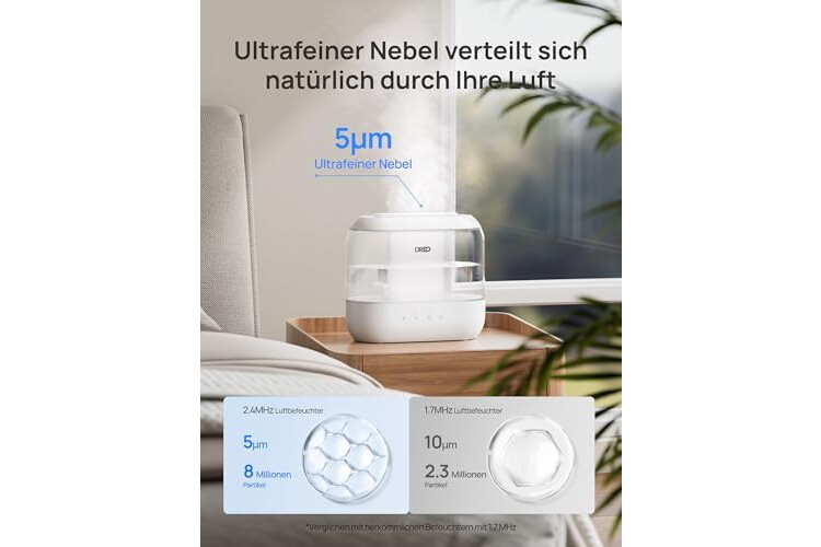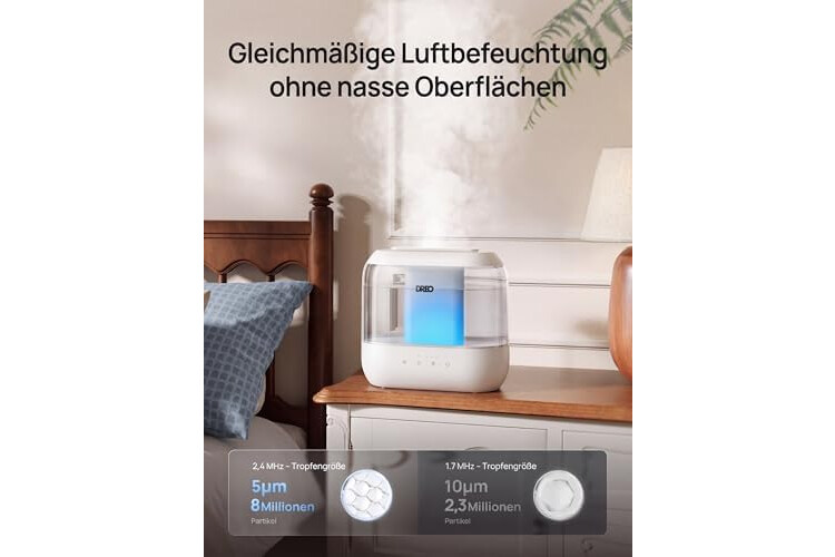 | Spezielle Eigenschaften | Aromadiffusor, Geräuscharm, Nachtlicht, Ultraschall-Technologie, Verstellbare Feuchtigkeitsregelung |
