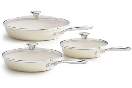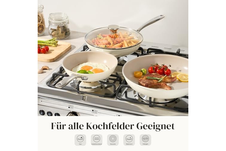 Redchef Pfannenset Keramik Induktion 6-teiliges, Antihaft Bratpfannen 20 24 28 cm mit Deckel für alle Herdarten, Edelstahlgriff, PTFE-frei PFAS-frei PFOA-frei, Backofenfest, Spülmaschinenfest (beige)