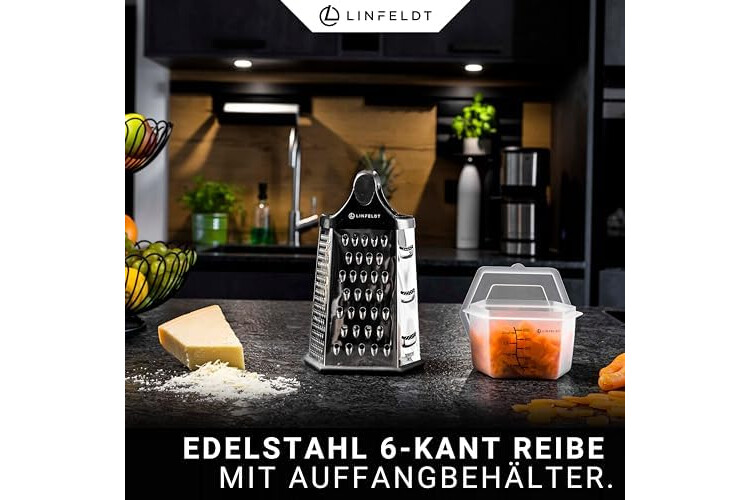 6-Kant Reibe Edelstahl Küchenreibe mit Behälter - Rostfrei Spülmaschinengeeignet 23x14cm Multi Reibe Küche - Küchenreibe mit Auffangbehälter & Griff