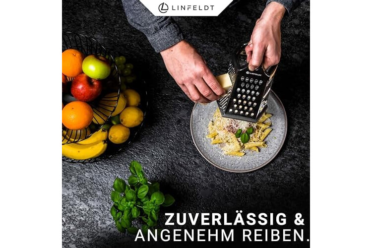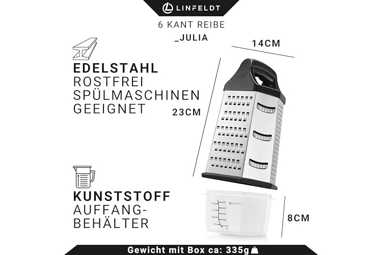 REINIGUNG? SPÜLMASCHINENFEST! Die Reibe ist aus hochwertigem und rostfreiem Edelstahl. Durch die Materialauswahl kannst Du die Reibe mit Behälter problemlos in deine Spülmaschine zur Reinigung geben - wie bequem!