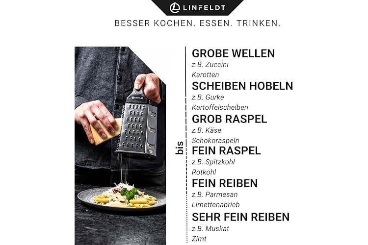 VIELSEITIG? 6 REIBE-VARIANTEN! Anders als eine Vierkantreibe hat diese Raspel ganze 6 Seiten mit unterschiedlichen Reibe-Möglichkeiten. Zusätzlich erhältst du ein feines und ein grobes, wellenförmiges Reiben!