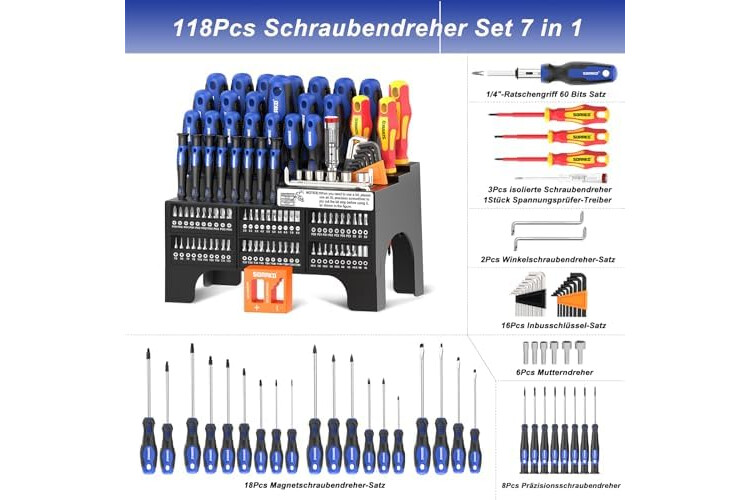 SORAKO 118tlg Schraubendreher Set magnetisch, inkl. Ratschenschraubendreher, Bits, Präzisionsschraubendreher, isolierte Schraubendreher, Spannungsprüfer, für die Wartung zu Hause und im Büro