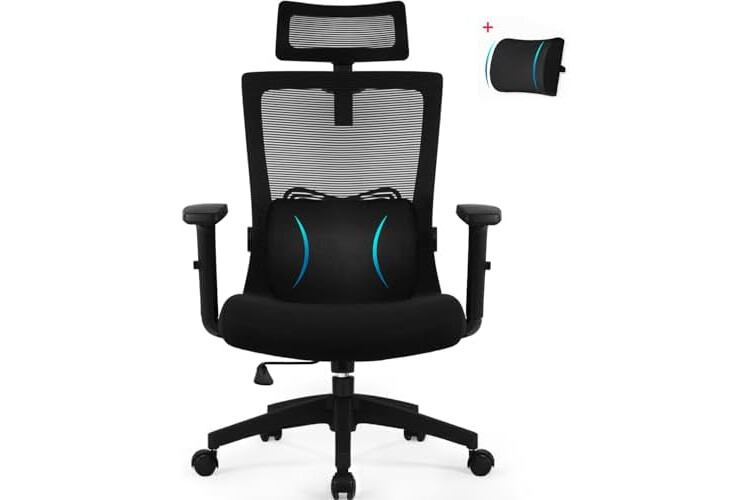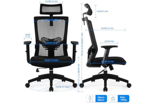 Daccormax Bürostuhl Ergonomisch, Schreibtischstuhl mit Verstellbarer Kopfstütze, Armlehnen, Lendenwirbelstütze, Drehstuhl Wippfunktion, Chefsessel aus Mesh,Rückenschonend, Bürostuhl 150kg