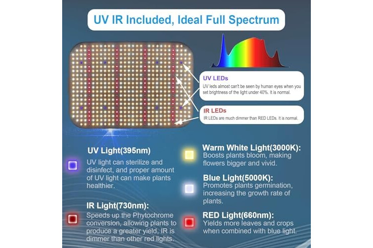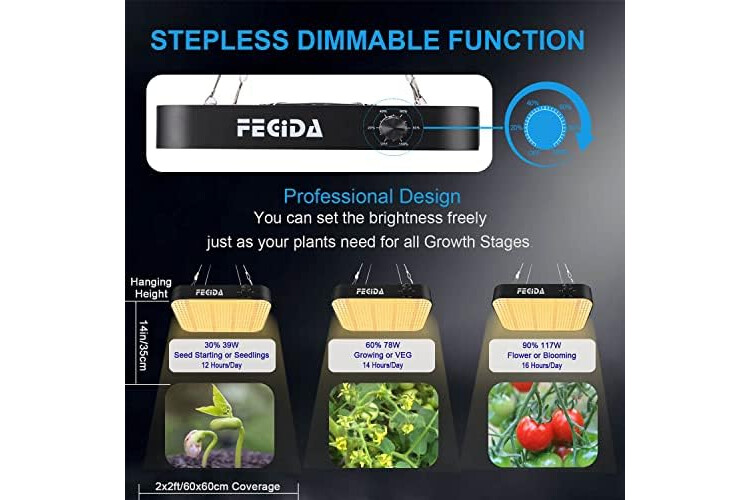 Stufenlose Dimmfunktion & Sparen Sie Ihr Geld --- Dieses LED Grow Light ist mit stufenloser Dimmfunktion konzipiert. Sie können die Helligkeit und Leistung des Wachstumslichts von 0-100% für verschiedene Wachstumsstufen frei einstellen, müssen aber die Helligkeit nicht bei 100% halten und die Hängehöhe der Wachstumslampe für verschiedene Wachstumsstufen einstellen. Einfach zu bedienen, sparen Sie Strom und Ihr Geld.