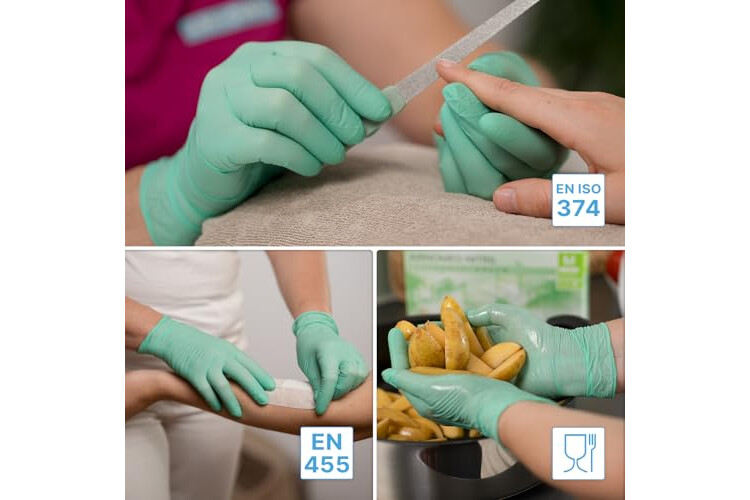 ZUVERLÄSSIGER SCHUTZ ✓ Diese grünen Nitrilhandschuhe erfüllen höchste Standards (EN 455 & EN 374) und bieten Schutz vor Viren, Chemikalien & Co. - ob für Hygiene- & Reinigungsarbeiten zuhause oder im professionell medizinischen Bereich!