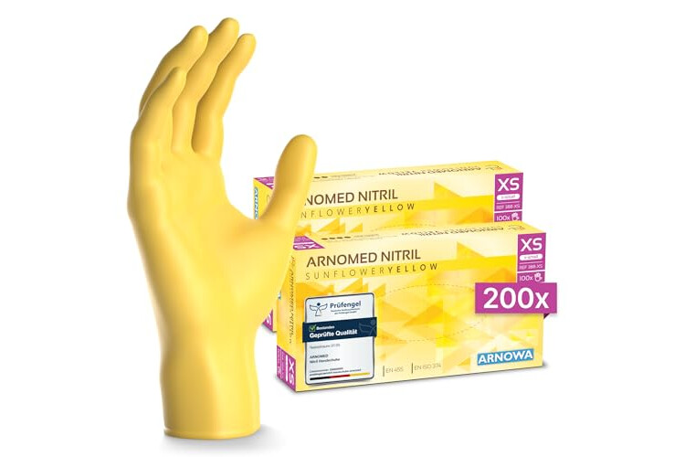 200x ARNOMED Einweghandschuhe Gelb (2x100 Stück), Einmalhandschuhe XS, Nitril Handschuhe Einweg, Nitrilhandschuhe puderfrei, Gummihandschuhe Einweg, Schutzhandschuhe, Handschuhe Nitril in XS, S, M, L