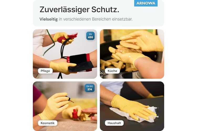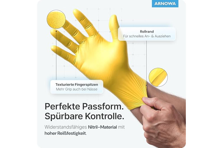 ZUVERLÄSSIGER SCHUTZ ✓ Diese gelben Nitrilhandschuhe erfüllen höchste Standards (EN 455 & EN 374) und bieten Schutz vor Viren, Chemikalien & Co. - ob für Hygiene- & Reinigungsarbeiten zuhause oder im professionell medizinischen Bereich!