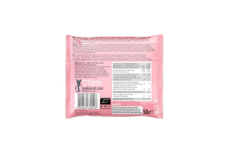 Preisgekrönte vegane Kekse von Kookie Cat. Wir setzen hohe Qualitätsstandards bei Produktion, Rohstoffen und Verpackung. Unsere Cookies werden mit Liebe und Sorgfalt in unserer hochmodernen Fabrik hergestellt.