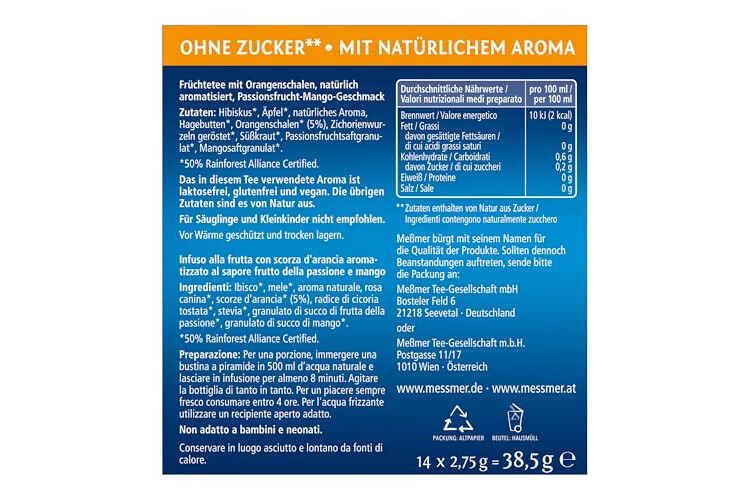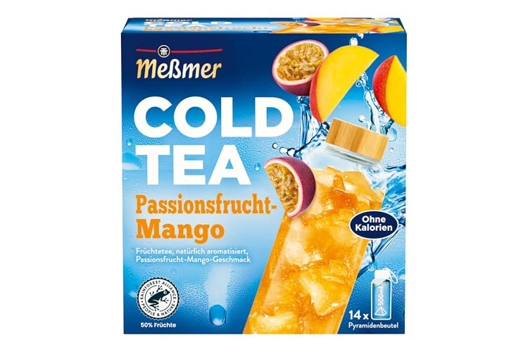 Meßmer Cold Tea Passionsfrucht-Mango | Belebe dein Wasser mit dem spritzigen Geschmack | ohne Zucker | ohne Kalorien | Alternative zu zuckerhaltigen Getränken wie Limonade | 14 Pyramidenbeutel