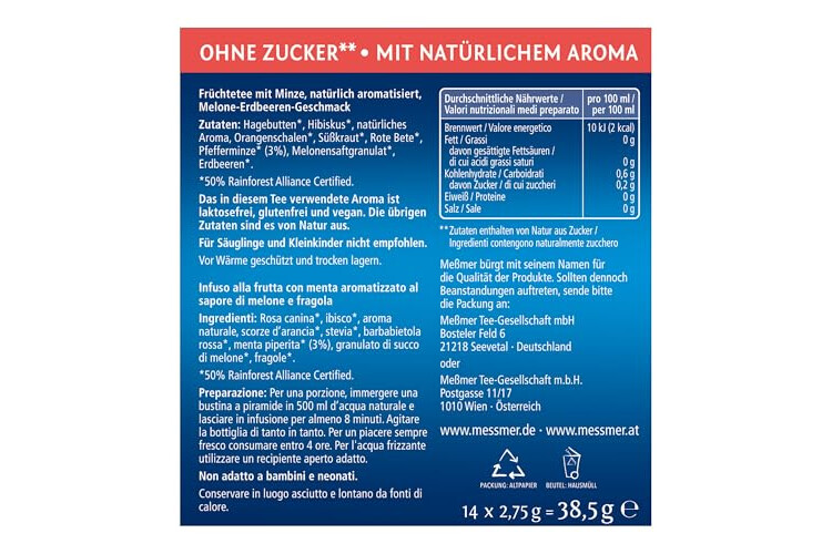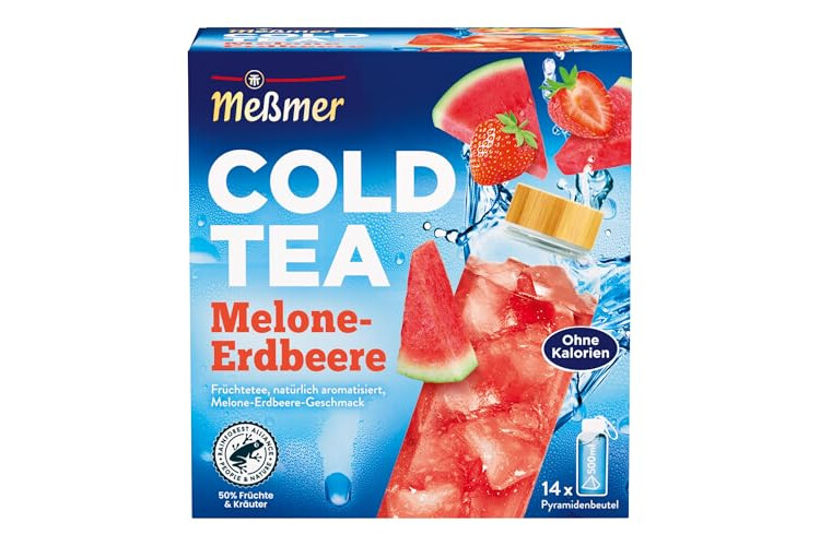 Meßmer Cold Tea Melone-Erdbeere | Belebe dein Wasser mit dem spritzigen Geschmack | ohne Zucker | ohne Kalorien | Alternative zu zuckerhaltigen Getränken wie Limonade oder Saft | 14 Pyramidenbeutel