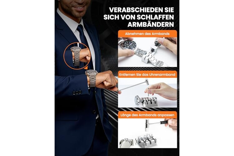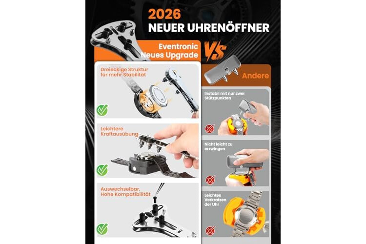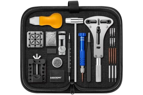 [Neu Upgraded Uhrenwerkzeug] - Eventronic Uhrenreparaturset haben die meisten Werkzeuge, die Sie für die Reparatur Ihrer Uhr benötigen. Uhrengehäuse-Öffner, Uhrenarmband-Glieder-Entferner-Werkzeug, Splintentreiber, Hammer, Zange, Federsteg-Entfernungswerkzeug, Bandhalter, Uhrengehäuse-Halter, Schraubendreher, Pinzette.(Hinweis: Der Uhren-Back Pry Opener ist 0,041inch dick.)
