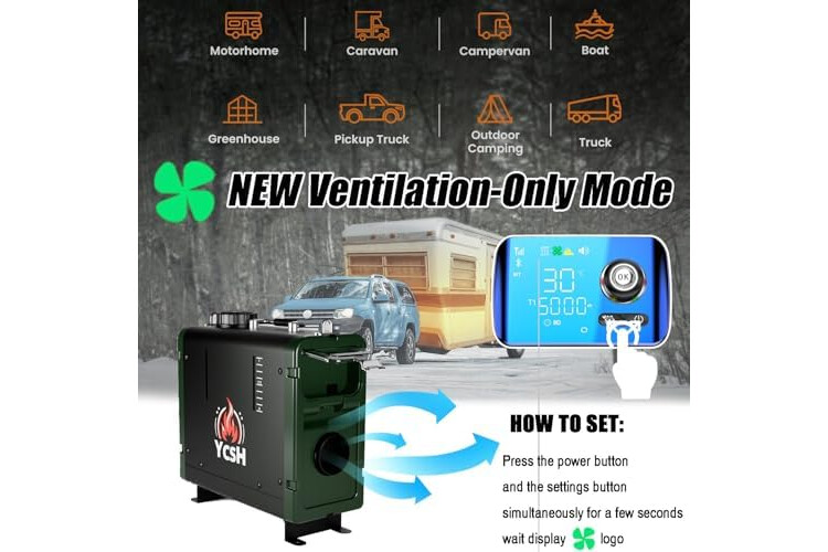 🚐 【Nur Lüftungsmodus】:Dieses Gerät hat nur Lüftungsfunktion und kann Luftzirkulation erreichen, ohne die Heizfunktion zu aktivieren. Diese Wahl ist besonders an heißen Tagen vorteilhaft und kann auch Wasseransammlungen verhindern. Diese Funktion ist sehr geeignet für Wohnmobile und Wohnwagen.