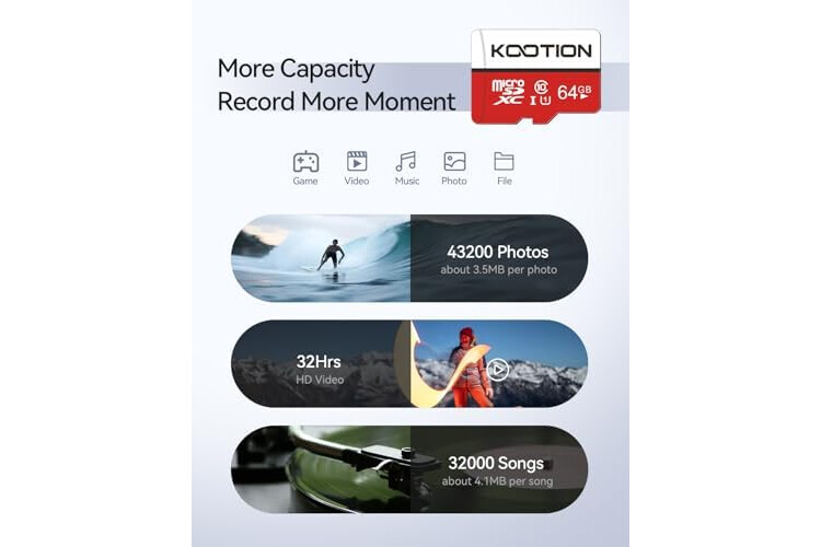Die KOOTION 64GB Micro SD Karte, 64GB Micro SD Speicherkarten 2er-Pack , Sie können stundenlang full HD-Videos auf der micro sd speicherkarte und haben immer noch platz für die videos, fotos, musik, filme und andere dateien, die sie aufnehmen, speichern und teilen möchten.